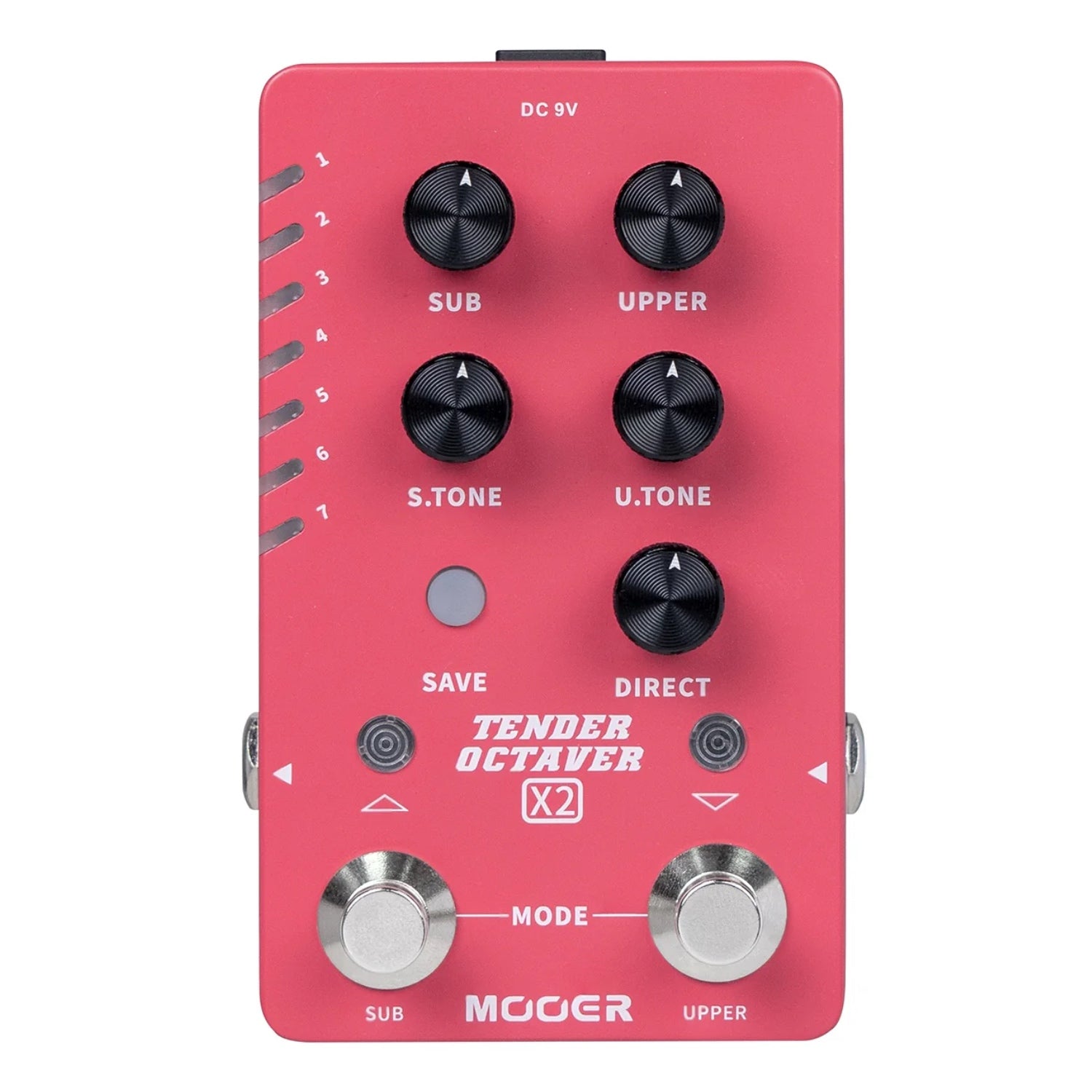 El pedal también contiene 14 ranuras preestablecidas, lo que permite a los usuarios experimentar y guardar sus combinaciones de parámetros favoritas con el botón "Guardar". Al estilo clásico de MOOER, esto se ha presentado de forma minimalista, con 7 luces LED que representan la gama completa de 14 espacios para guardar, iluminándose en azul o rojo dependiendo de en qué mitad de los espacios se esté explorando. Cada ranura se puede guardar o navegar a través de los dos interruptores de pedal “Sub” y “Upper”, lo que proporciona un ejemplo más de la dedicación de MOOER para aprovechar al máximo una interfaz minimalista.